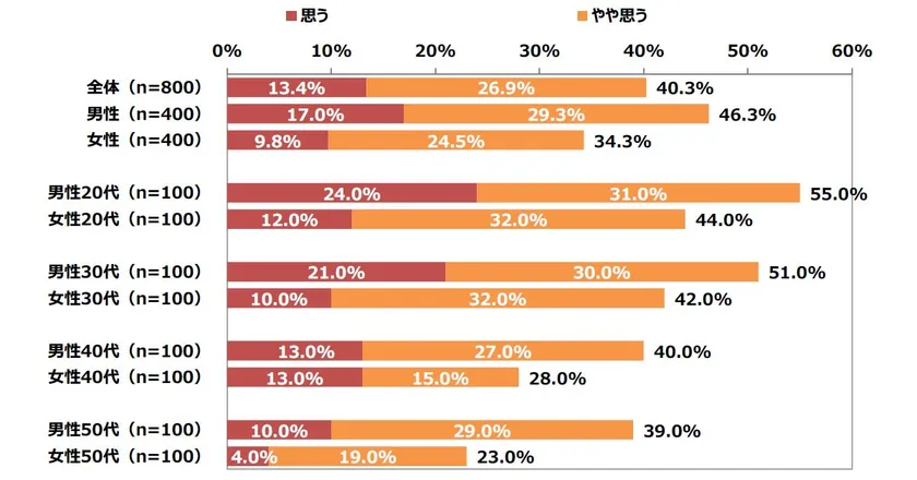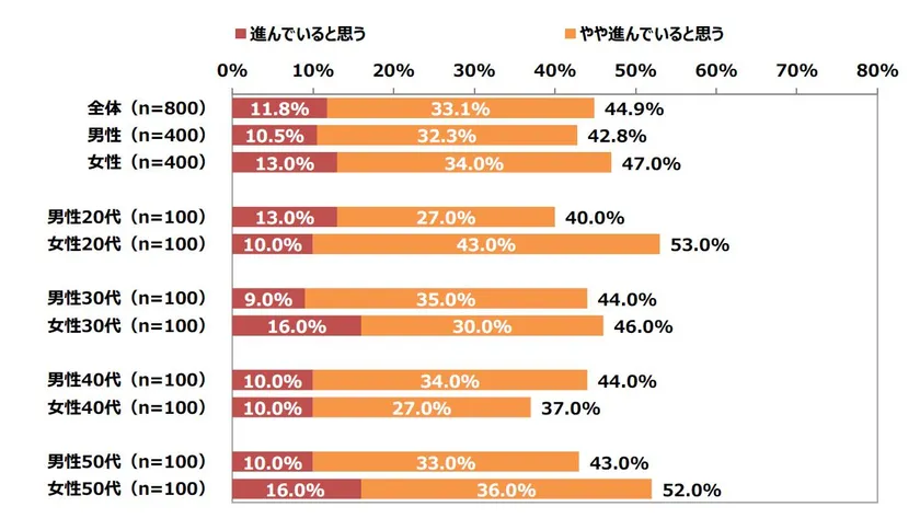 「進んでいる」と回答したのは全体では計44.9%と半数に満たない結果となりました。性年代別に見ると、20代の女性は計53.0%が「進んでいる」と回答しています。一方で女性40代は37.0%と他年代より低い結果となりました。女性活躍が進んでいるか否かは性別や年代なので感じ方が違うのかもしれません。