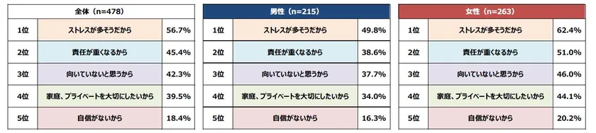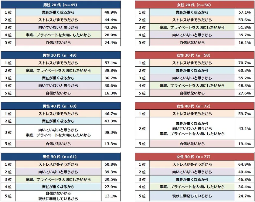 20代は高い役職に対し、「責任の重さ」を感じているようです。30代、40代は「ストレスの多さ」を危惧していることがわかります。50代は「ストレスの多さ」に加え、「向いていない」と感じている方が多い結果となりました。