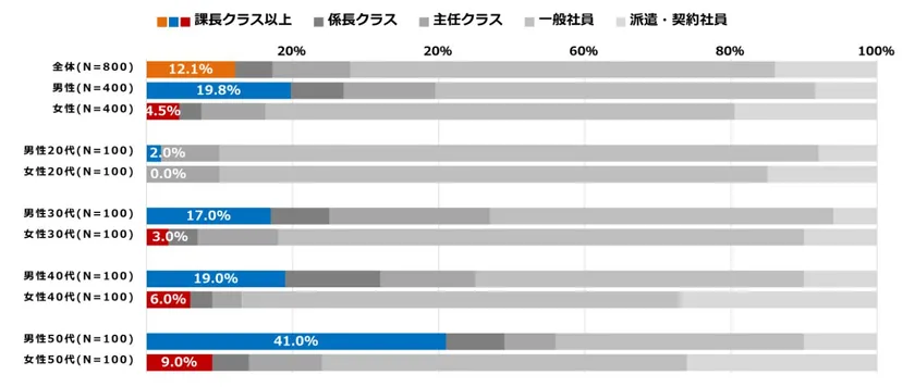 では、現在の役職はどうなのかを見てみましょう。今回の調査は役員、経営者を除いた調査となってはいますが、課長クラス以上と回答した方は12.1%となりました。性別で比較をすると、男性は19.8%、女性は4.5%となっています。女性活躍の政策の一環として「指導的地位に占める女性の割合を30%程度に上昇させる」と掲げていますが、まだまだ目標は遠そうです。