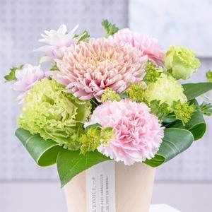 - ドライフラワーとミックスしてナチュラルにくすみカラーのトルコキキョウは、ドライフラワーやグリーンと合わせて飾ると、ボタニカルな雰囲気に。木製の器やアンティーク調の花瓶と相性抜群です。