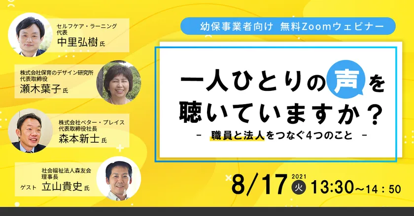 本セミナーでは、保育施設における離職理由の大きな要素である「職場のコミュニケーション」の課題と向き合い続けているセルフケア・ラーニング代表の産業カウンセラー 中里 弘樹氏に、その解決に大切な4つのポイントをお話しいただきます。さらに、保育者や事業者のためのサポートをそれぞれ別の角度から提供している3社代表と、先進的な取組に定評がある社会福祉法人森友会 理事長の立山 貴史氏によるパネルディスカッションで、より深く、より多角的に、課題への向き合い方を考えます。