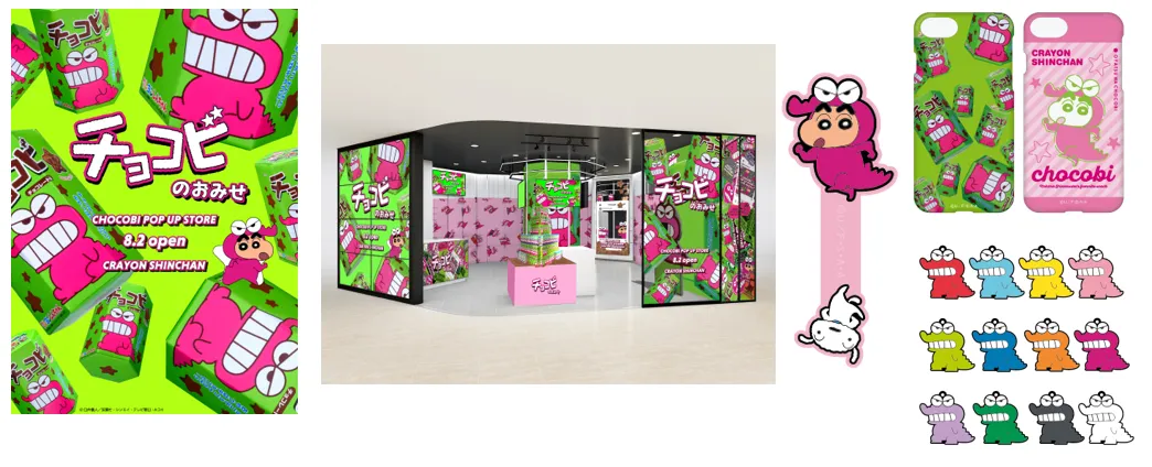 ポップアップストアでは、しんちゃんの好物「チョコビ」やチョコビのパッケージでおなじみの「ワニ山さん」、そしてワニ山さんの格好をした、しんちゃんのオリジナルグッズを数多く発売。ワニ山さんが初めてピンク色以外のカラーになったカラフルな商品も登場します。