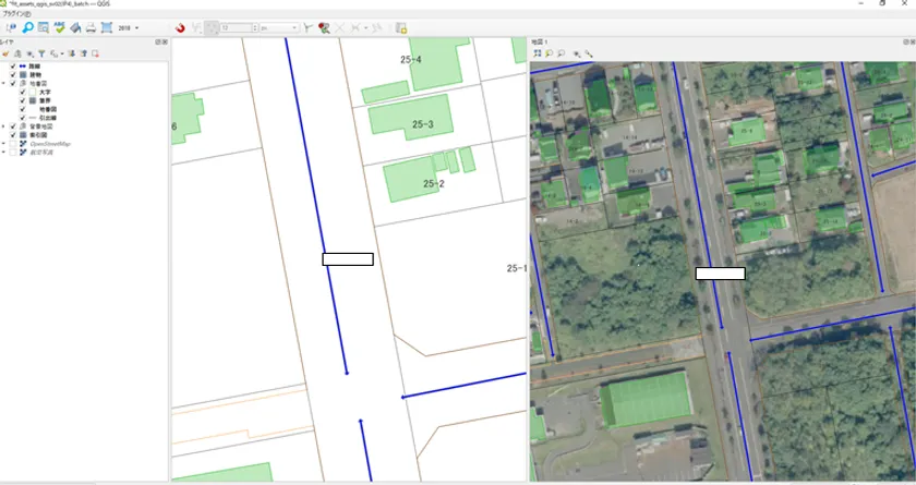 機能概要:地図画面を2つに分割し種類の異なるレイヤを比較しながら
