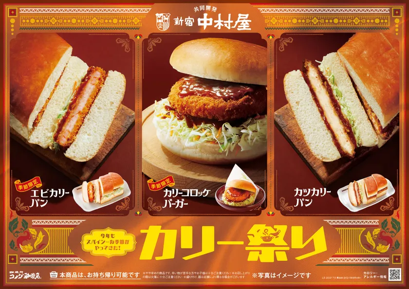 新宿中村屋と共同開発したオリジナルカリーソースは、厳選したスパイスを使用した深みのあるスパイシーな味わいが特徴。今年の「カリー祭り」には、スパイスとの相性が抜群の3商品をご用意しました。エビのぷりぷり食感とスパイスの深みのある味わいがたまらない新作「エビカリーパン」、国産じゃがいも使用のコロッケの甘みで、マイルドなスパイシーさが楽しめる、昨年好評につき再登場の「カリーコロッケバーガー」。そして、大人の味わいで定番を勝ち取った「カツカリーパン」の3種類です。どのカリーも個性的な美味しさです。テイクアウトでお家でもお楽しみいただけます。あなたの推しカリーはどれ!?