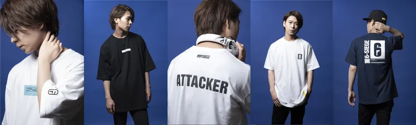 「レインボーシックス シージ」のロゴを生かしたシンプルなタイポグラフィーをデザインに落とし込んだアイコニックなベーシックモデルです。フロントはプレイ中の攻守のオペレーターをイメージしたロゴを配置し、バックは6のロゴをメインに世界各国のオペレーターがゲームの世界でつながっている様をイメージしたデザインになっています。