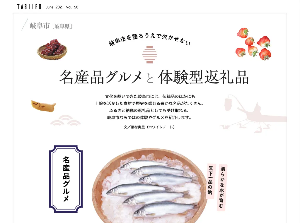 観光するだけでなく住みやすいまちとしても注目されている岐阜市の生活者視点で見る魅力を特集したコラムや、ふるさと納税の返礼品としても受け取れる飛騨牛、ユネスコ無形文化遺産登録を目指している鵜飼観覧船の招待券など、岐阜市ならではの体験やグルメを紹介しています。