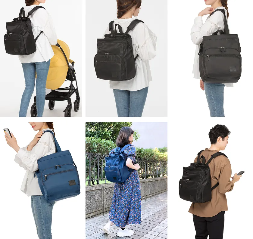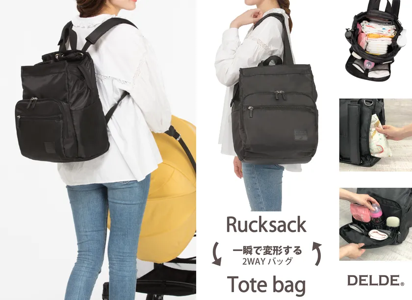 子育てファミリー向け「DELDE マザーズトートリュック」新発売 欲しい物すぐ出せる、収納機能15個の多機能2WAYバッグ パパもママも持ちやすい、カジュアルなデザイン