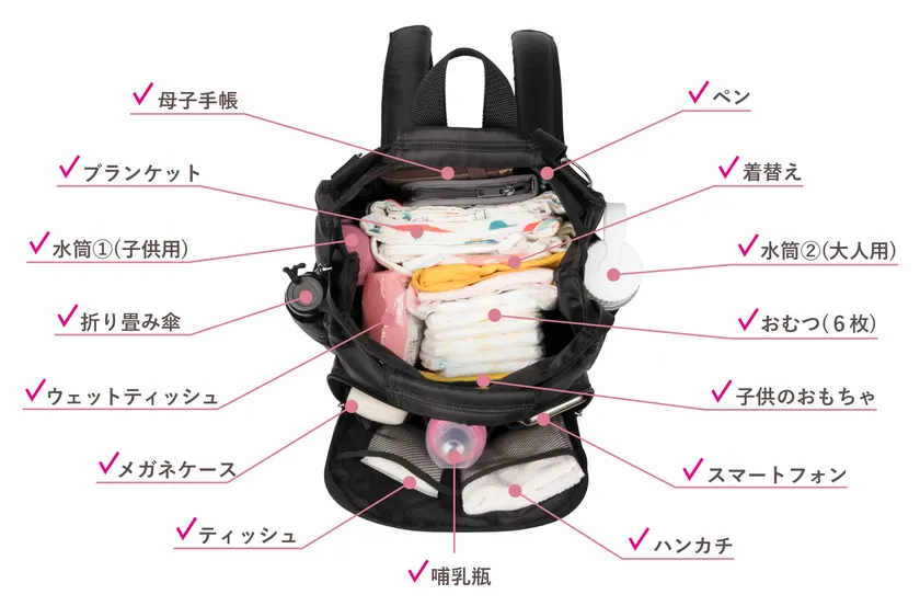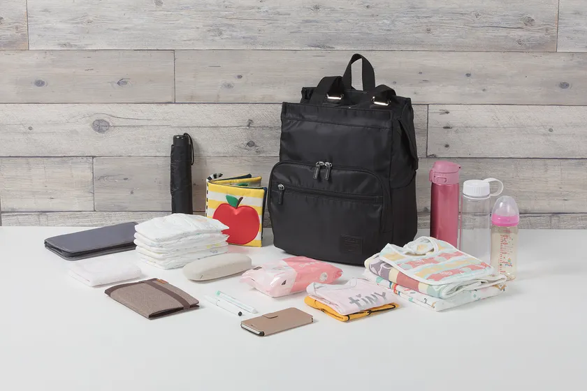 子どもと外出する際に必要な荷物が、15個の収納機能にキレイに収められる大容量仕様です。母子手帳、ブランケット、水筒(子ども用&大人用)、折りたたみ傘、ウェットティッシュ、メガネケース、ティッシュ、哺乳瓶、ハンカチ、スマートフォン、子どもの玩具、おむつ(6枚)、着替え、ペンなどが入ります。