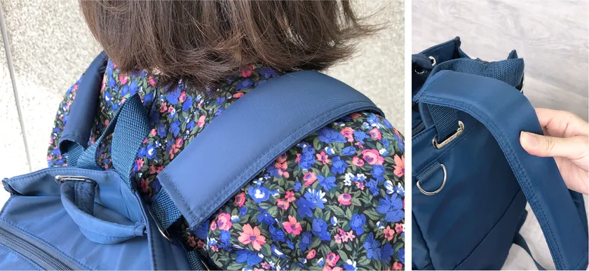 トートとリュックどちらの使い方にも一瞬で切り替えられるため、人混みの中でトートにしたい時や、荷物が増えてリュックにしたい時など、シーンに合わせて、肩紐が余らず切り替えて使えます。A4サイズ対応で、開口部が大きく開くことでポケットの中やバッグの中身が見渡しやすく、荷物の出し入れが簡単!