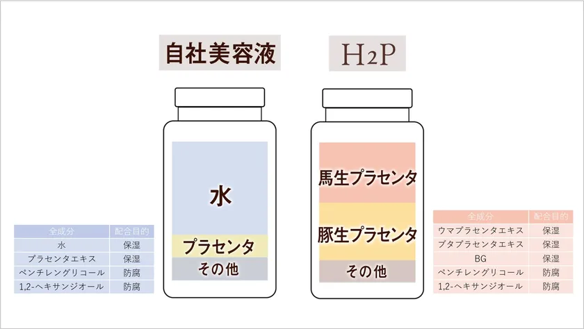 また、通常プラセンタは水を使用してエキス抽出されます。H2Pのプラセンタはあえて水を使わずにプラセンタそのもののエキスを抽出する技術で、ノンウォーターを実現しました。