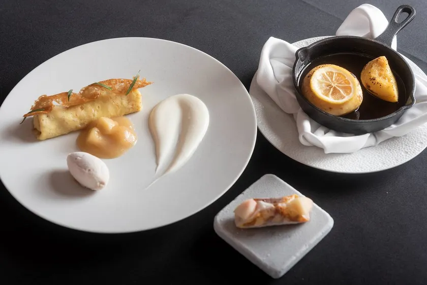 【福島県産 白桃のクレープシュゼット 香り高い桃のローストと共に】