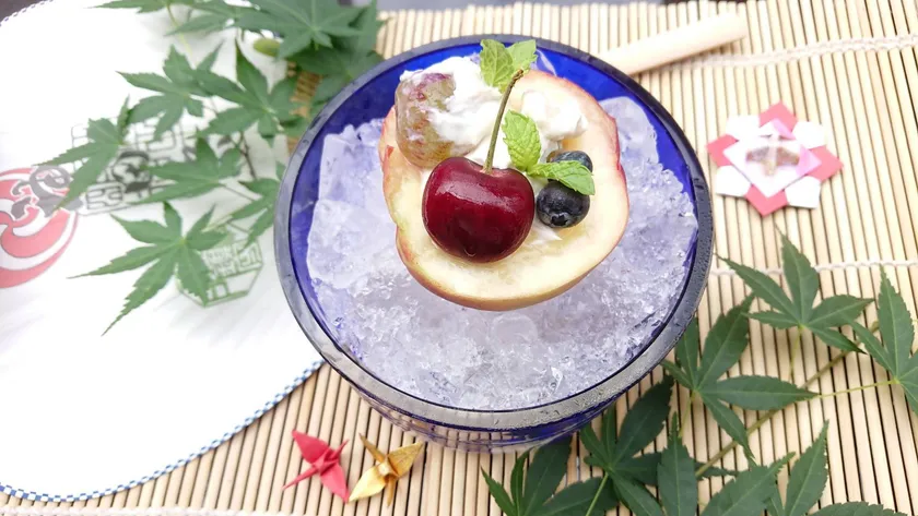 桃の釜を作りフルーツを和えて盛り付けているので、桃をくり抜きながら召し上がっていただきます。