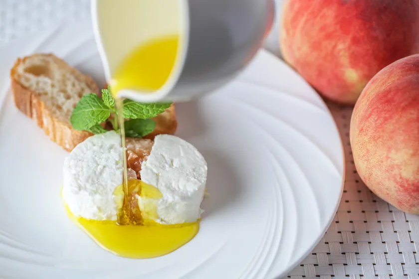 フレッシュな桃を白ワインでマリネして、サント・モール(山羊のミルクで作ったフレッシュチーズ)でサンドしました。食間や食後のお口直しにぴったりなフレッシュな味わいのチーズです。