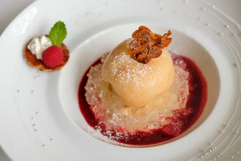 “ピーチ・メルバ”ブラッスリー ポール・ボキューズ 銀座スタイル 福島県産 白桃のコンポート ヴァニラアイスクリーム ラズベリー