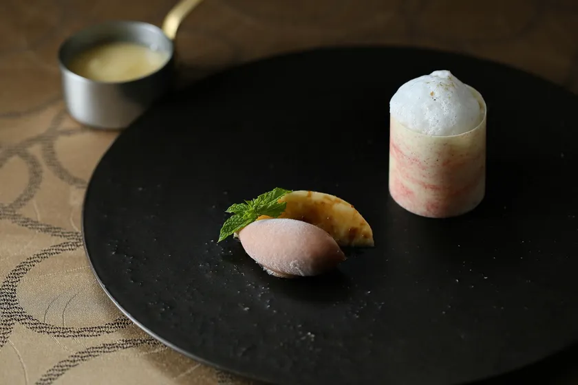 【桃(福島県産)&未熟ぶどう(ヴェルジュ)をマール ドゥ キザンのソースで】