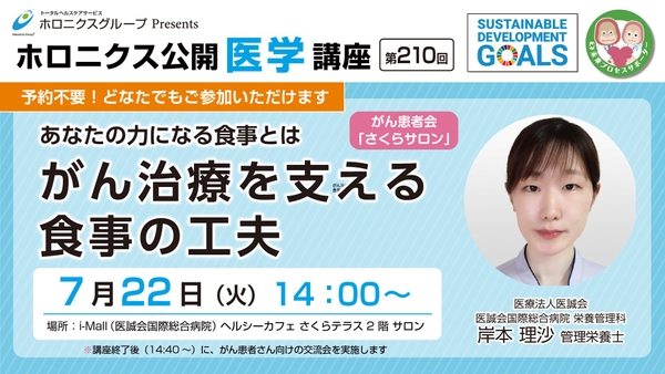 医療法人医誠会(大阪府大阪市 代表者:谷 幸治)では、第210回ホロニクス公開医学講座 『あなたの力になる食事とは がん治療を支える食事の工夫』を大阪市北区南扇町にあるi-Mall内ヘルシーカフェ「さくらテラス 2階サロン」にて2025年7月22日(火)に開催いたします。