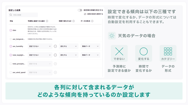 ステップ2:推論データである各列に対して「予測時に設定できる値か」「時間で変化するか」、「データの形式」を設定します。