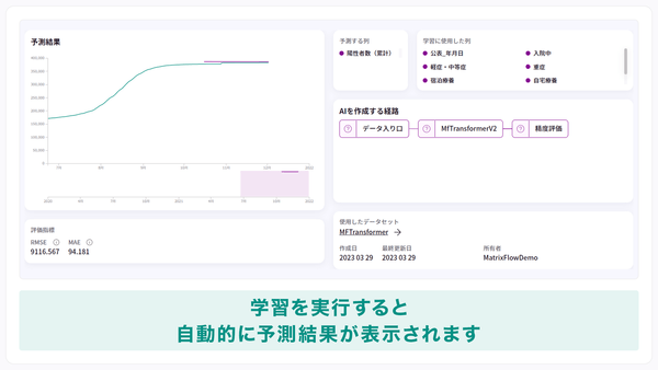 ビジネスのためのAI活用プラットフォーム「MatrixFlow」を提供する、株式会社MatrixFlow(本社:東京都台東区、代表取締役:田本 芳文)は、時系列予測で複数の要因を学習できるサービス「MFTransformer 」に、新機能追加のアップデートを行いました。