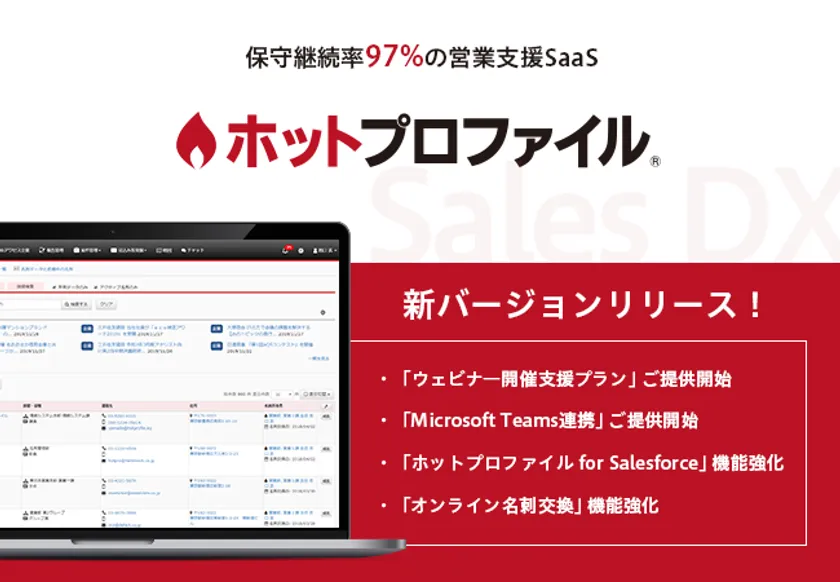 法人向けソフトウェアパッケージ、クラウドサービスを提供する株式会社ハンモック(本社:東京都新宿区、代表取締役社長:若山 大典、以下 ハンモック)は、営業支援SaaS「ホットプロファイル」の機能およびラインナップを拡充し、営業のオンライン化に必要な機能強化を行った新バージョンをリリースいたしました。