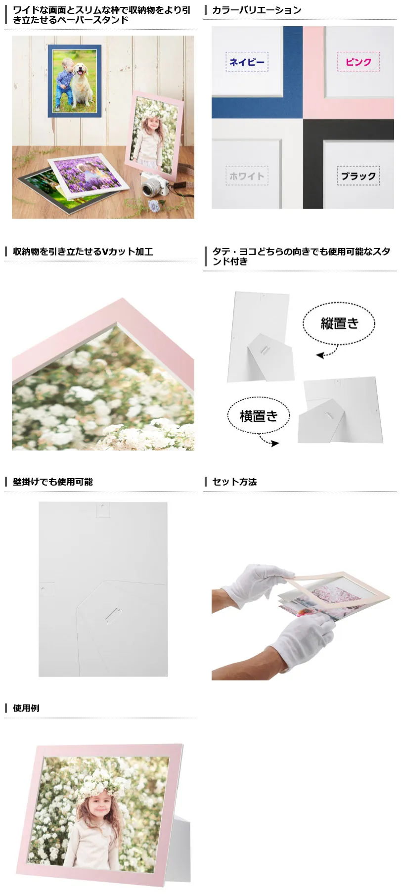 枠幅が23mmと従来のペーパースタンドよりもスリムなペーパースタンド。A4サイズの写真やクリアファイルも収納可能。画面サイズも広くなり、収納物をより引き立たせます。
