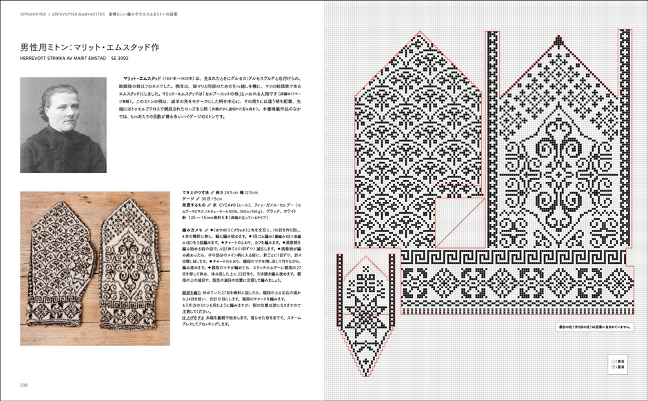 日本語版では、原書版(『SELBUVOTTER』2016年・ノルウェー 刊)のシンプルな編み図に、編み目記号の説明や柄が挿入される箇所の補足を加えました。巻末にはオリジナルミトンが作れる子供用チャート、女性用チャート、男性用チャートがついています。