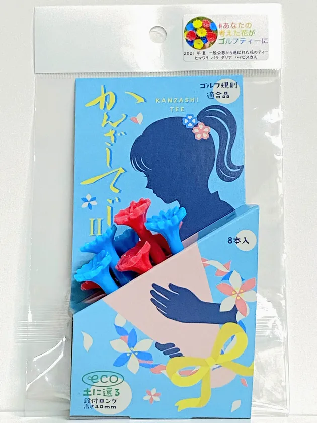 新商品パッケージは地元の高校生にデザイン依頼し製作、この度、新ゴルフティーが新登場いたします。かんざしのように髪に挿してもかわいい、カラフルなお花のデザインです。