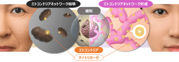 細胞にダメージが蓄積すると肌老化が進行してしまいます。今回の研究から、マイトリガーゼが肌老化に重要な役割を果たしている可能性がより明確になりました。このことから、若返りの鍵「マイトリガーゼ」を活性化できれば、ミトコンドリアネットワークが正常に形成され、肌老化に抵抗できることが期待されます。