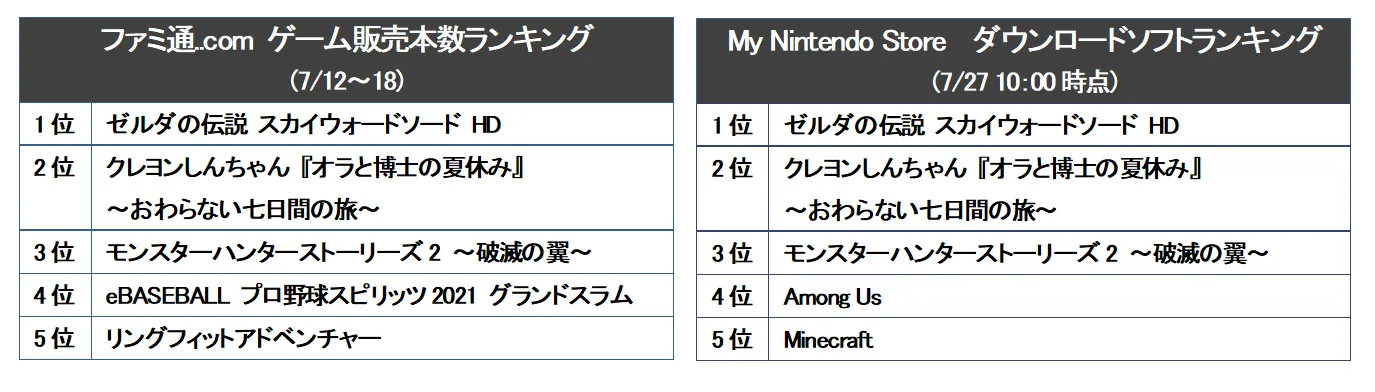 ファミ通.comの販売本数ランキングは、ネット通販を含むゲームソフト販売店舗の購買データに基づき、PlayStationやNintendo Switchなどのソフトの販売本数を集計したものです。本調査によりますと、【クレヨンしんちゃん『オラと博士の夏休み』~おわらない七日間の旅~】は、7月15日の発売後4日間の店頭売上が107,319本を記録し、7月12日~18日の販売本数ランキングにおいては同週発売の「ゼルダの伝説 スカイウォードソード HD」に続く第2位となる好調なスタートを切りました。Amazon、楽天、TSUTAYAなどの主要オンラインショップにおいても軒並み販売ランキング1位となり、殆どの販売店において売り切れとなる大きな反響をいただいております。