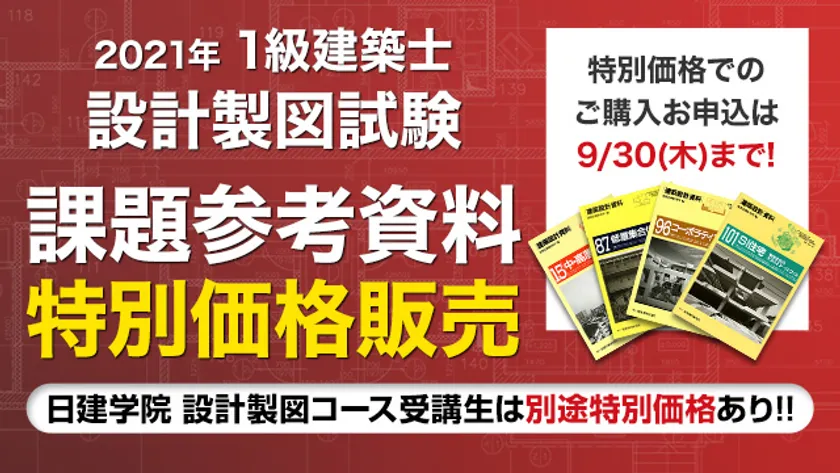 建築・住宅・インテリア・資格等の専門書を発行する株式会社 建築資料研究社/日建学院(所在地:東京都豊島区、代表取締役社長:馬場 栄一)は、2021年1級建築士 設計製図試験 課題参考資料として、設計課題研究に最適な「建築設計資料」を期間限定で特別価格にて販売いたします。