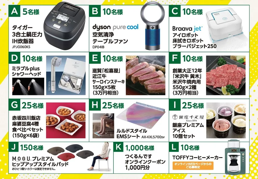 「つくるんです(R)」各シリーズ商品を税抜3,900円以上ご購入いただいた方に、抽選で以下の豪華ギフトをプレゼントいたします。応募は、店頭配布の応募ハガキ、またはつくるんです(R)公式サイト( https://www.tukurundesu.com/ )よりお願いいたします。