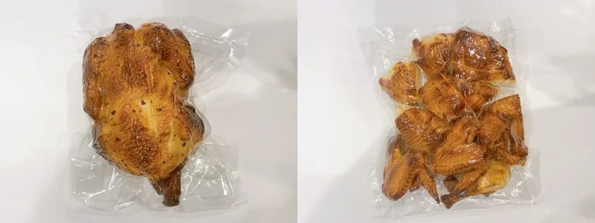 「グレイトチキン」丸鶏真空パックタイプ(左)とカット済み真空パックタイプ