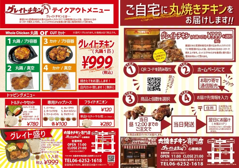 「グレイトチキン」テイクアウトメニュー(左)と配送メニュー