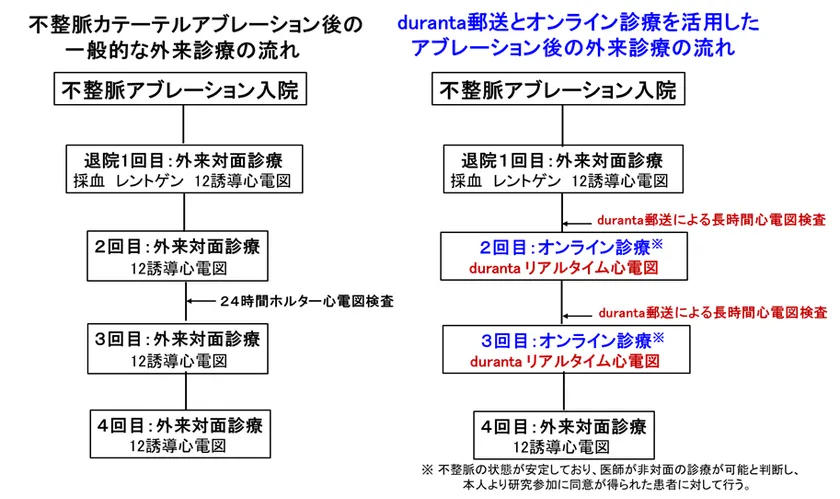 不整脈のカテーテルアブレーション治療※5後で状態が安定しており、医師が非対面での診療が可能と判断した患者において、郵送された「duranta」での長時間心電図検査やリアルタイムでの心電図波形を基に、「オンライン診療ポケットドクター」を用いたオンラインでの診察と、対面による診察を組み合わせた循環器外来での新たな診療形態の安全性と有用性を検討します。