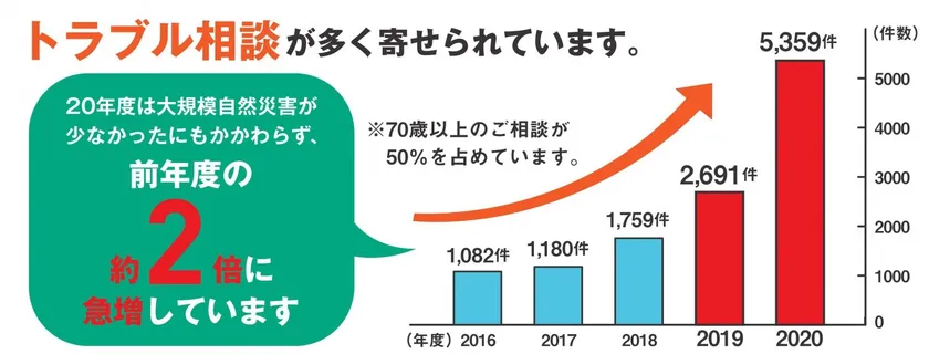 ・2020年度の住宅修理サービストラブルの相談件数は、2019年度の約2倍に増加。