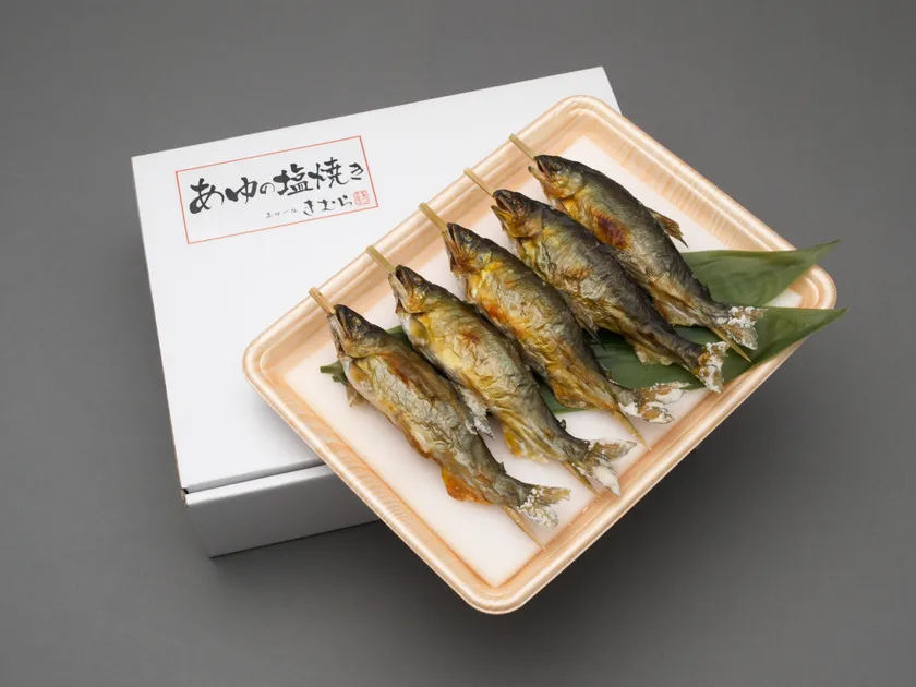 鮎は涼やかな香りが特徴の魚で「香魚」とも呼ばれます。鮎の専門店として、姿煮や一夜干し、南蛮漬けなど数多くの商品を取り揃えていますが、最も美味しい食べ方は“あゆの塩焼き”です。化粧塩でシンプルに味付けをした塩焼きは、淡白な味わいと鮎独特の風味を最大限に引き出します。