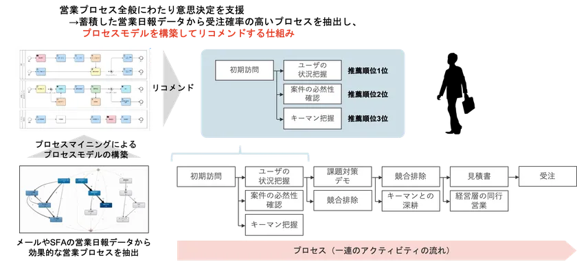 DX推進の手段として注目を浴びたRPAによる「業務プロセスの自動化」が一巡し、部分最適といった課題が見えてきた中、網羅的な業務プロセスの改善アプローチが可能な、プロセスマイニングへの注目が高まっています。イントラマート社では、かねてよりこのプロセスマイニングに着目し、東京大学 森川・成末研究室とともに、「営業活動における意思決定支援」をテーマに、営業プロセスにおいて受注効果の高い営業活動のリコメンドが可能となる意思決定支援システムの研究を重ねてきました。