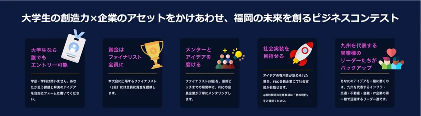 予想もつかない感染症や自然災害、先の見えない少子高齢化問題など、解決が難しい課題の多い今日、都市は絶えず柔軟な変化を問われ続けています。FSCは発足当初より、まちの課題を迅速に解決すべく、福岡市やFSC会員企業間での協働を行ってまいりました。今後も福岡市が日本最速の課題解決都市を目指し続けるためには、市民の創造力と積極的な参加が必要不可欠です。この度開催する「FUKUOKA SMART CITY AWARD」では、これからの未来を担う大学生の皆様からビジネスアイデアを募集し、グランプリを選びます。グランプリ受賞アイデアは、FSC会員企業と共に磨き上げを行い、社会実装を目指します。