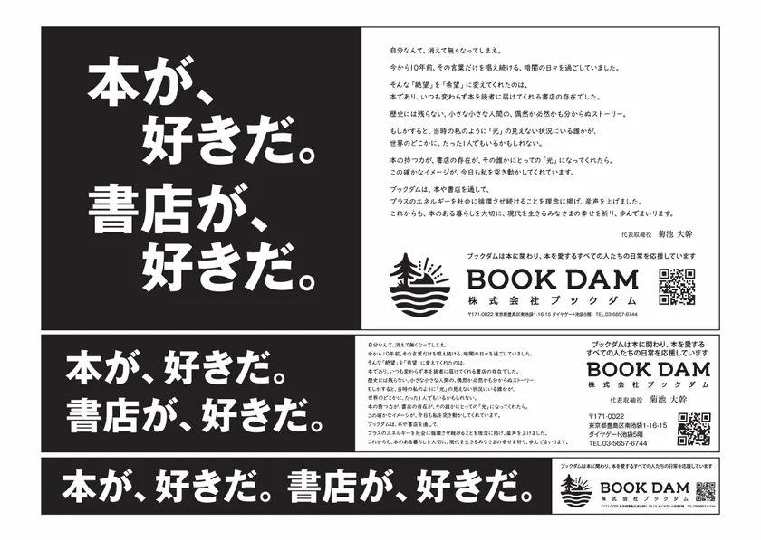当広告そのものは、本や書店に対する想いを言葉として放ち、当社の創業に至る経緯を記した内容になっています。日本においてはいわゆる“出版不況”と叫ばれて久しい状況が続いておりますが、それでもなお多くの人にとって、本や書店は日常になくてはならない存在であり続けているのではないでしょうか。