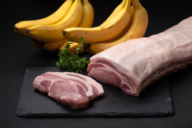 甘みの秘訣は、なんと「バナナ」。米や穀物よりも糖質が高いバナナを乾燥させてエサに混ぜたところ、脂肪の質が変化し、甘みが増加。脂っこさや豚のニオイがないので、女性や子どもでも食べやすく、「普段は豚肉を食べない子どもが、えびすもち豚ならおいしいと食べる」という嬉しい声も寄せられるほどです。