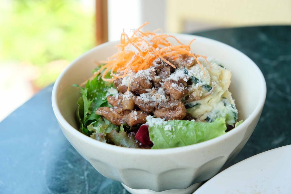 今回は、本場フィレンツェ屋台の味も同時に楽しんでほしいとシェフ才田のアイデアで、バラのモチーフの自家製ロゼッタパンを添えて提供いたします。パンにお好みの量のランプレドットを挟み、ぜひフィレンツェへ行った気分でお楽しみください。さらに夏に嬉しいさっぱりとしたバルサミコチキンとポテトサラダを添えたオリジナルサラダも付いて、味もボリュームも大満足いただけるまかない飯が登場しました。