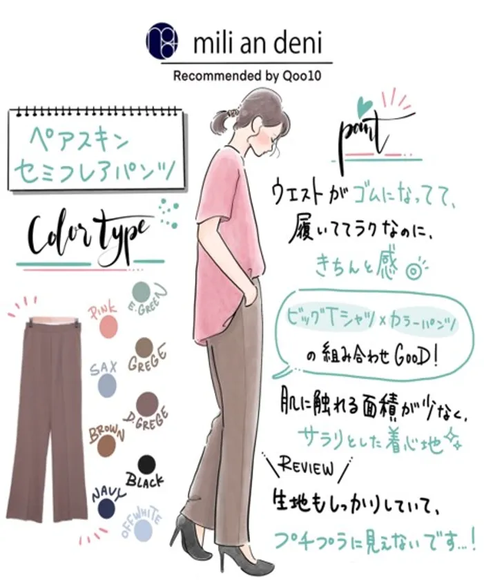 人気のコーナー、Qoo10 コーデ『今日のりおポチ』では、内田理央さんのこの夏のおススメファッションアイテムとしてmili an deni(ミリアンデニ)のペアスキンセミフレアパンツが紹介されました。