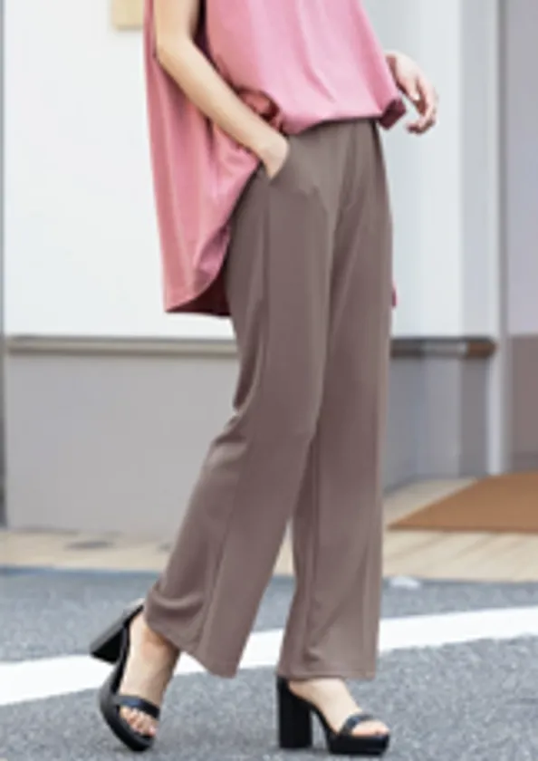 清涼感のある着心地が持続する「ペアスキン」素材で、ラインが綺麗なセミフレアデザインのパンツ。フロントタックが腰回りをゆったりさせ、ウエストゴム仕様でストレスフリーな履き心地を実現。
