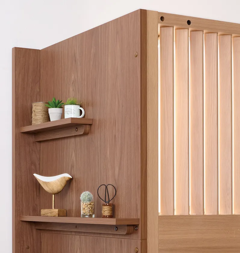 デスク天板にはホワイトオーク突板、角度によって目隠しにもなる格子パネルには天然木(ホワイトオーク材)を使用。デスク天板下には書類などが入れられるスリム収納棚をはじめ、本体の背面には2段の飾り棚を、デスク面の中央部にコード穴を設けるなど家具メーカーならではの丁寧な“ものづくり”で、インテリア性とともに高品質化に努めています。