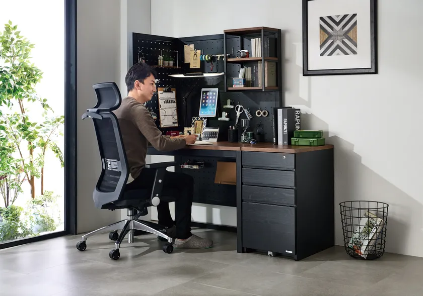 このほか、サイドチェスト、ワゴン、ラック、スチールパネル(大、小の2種類)でTRIMSは構成されていますが、2タイプのデスクのいずれかと大小2種類のスチールパネルを組み合わせていただくと、自分スタイルのテレワークデスクとしてご使用いただけます。