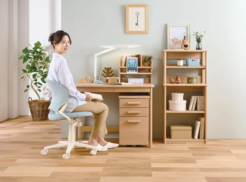いずれも学習家具メーカーとしての特徴を生かし、主要部材にはホワイトオーク突板、ナラ突板、タモ材などの木製を使用してインテリア色を高めています。