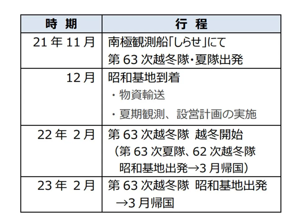 遠藤さんら越冬隊員は南極観測船「しらせ」で2021年11月10日(水)に日本を出発して南極に向かい、2021年12月より南極の昭和基地での活動に入ります。およそ1年2か月の基地での活動の後、2023年3月末に帰国する予定です。