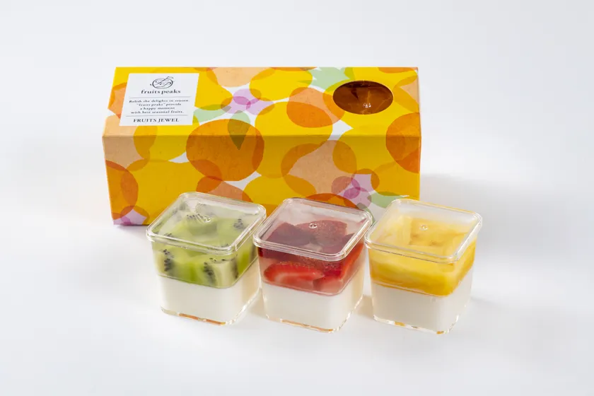 なめらかでクリーミーなバニラムースの上に、ジューシーなフルーツをトッピングし、さっぱりとしたゼリーで閉じ込めました。箱を開けたときにフルーツが可愛らしく、美しく映えるよう、キューブの大きさやフルーツのトッピング・カット方法にもこだわった商品です。