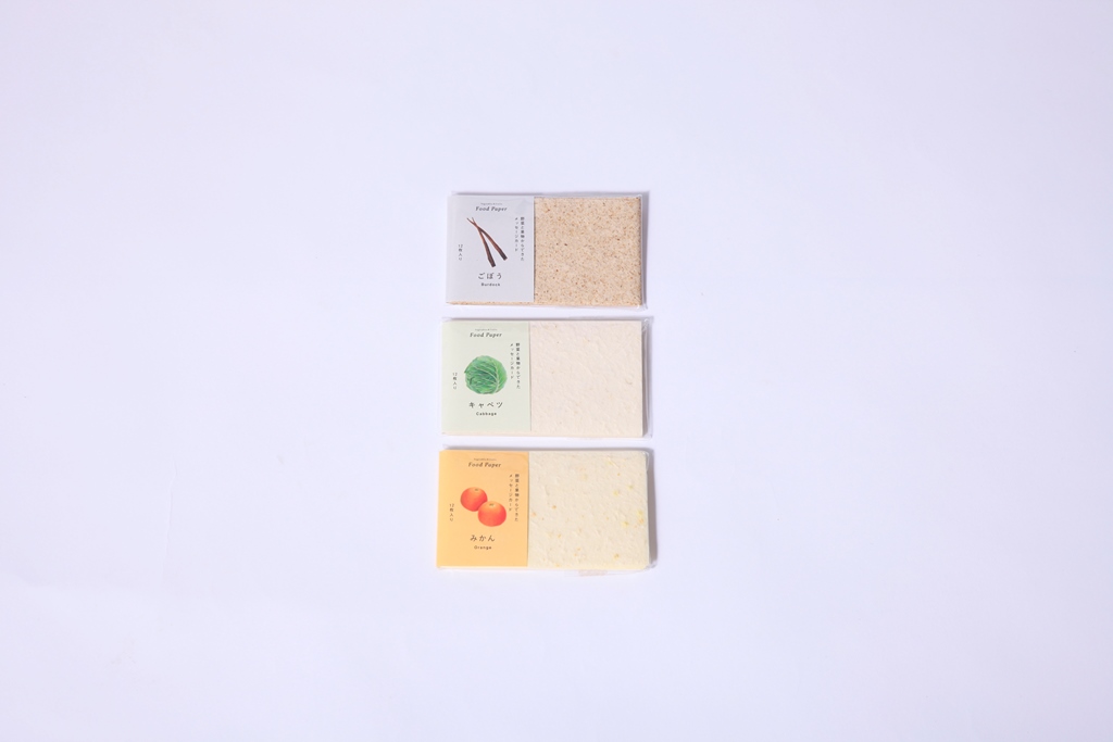 フードロスとして、廃棄予定の野菜や果物から作られた食物由来のメッセージカード。また100%土に還る地球に優しい紙文具です。