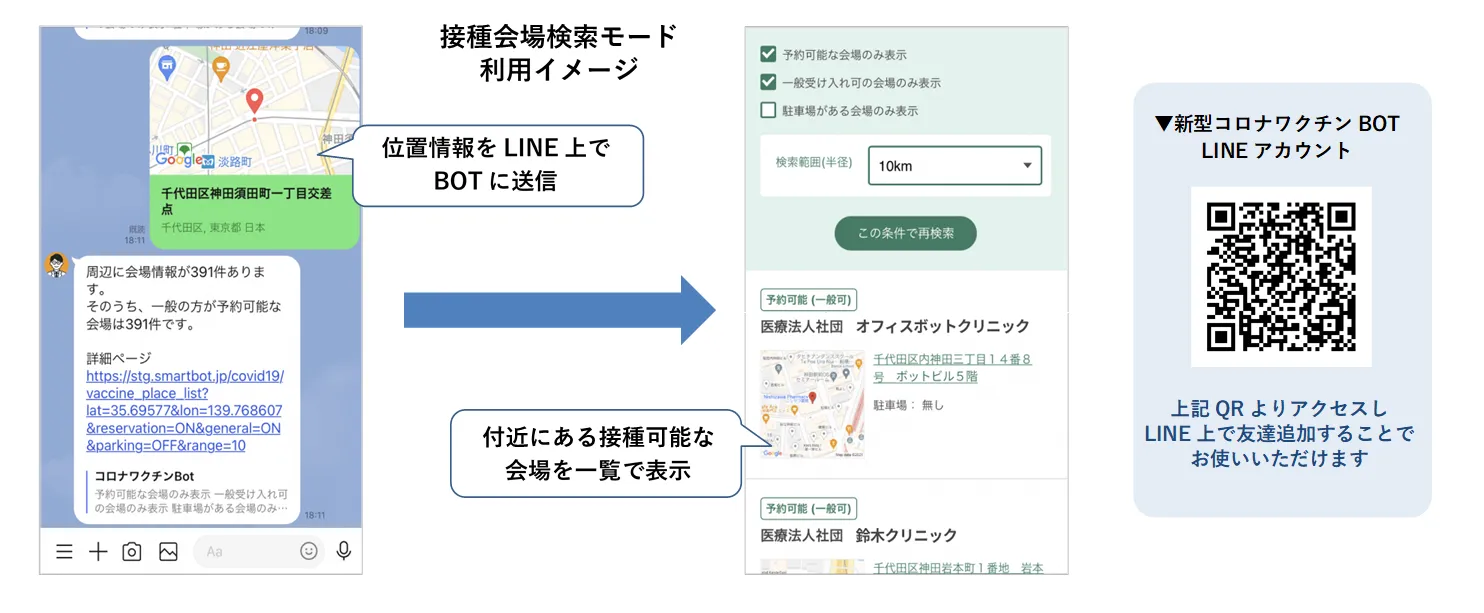 ●接種会場検索モード:BOTに位置情報を送信するだけで、近くのワクチン接種可能な会場を一覧で表示します。現在地からの検索はもちろん、検索地域は任意で変更できるほか、駐車場の有無など希望に応じた条件での絞り込みも可能です。