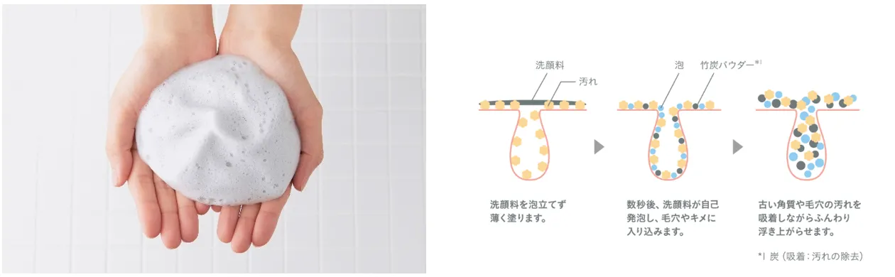 吸着成分「竹炭パウダー*1」が毛穴に残った皮脂汚れやメイク汚れを吸い寄せてキャッチ。